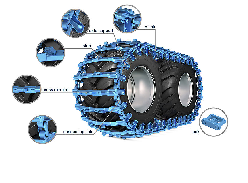 Elke pewag bluetrack bestaat uit een dwarsdrager met studs, gesmede schakels (ook connecting links genoemd), sloten, C-schakels en de lip.