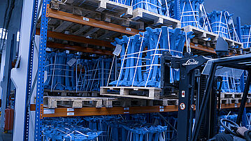 Om de bluetrack na de productie tegen roest te beschermen, krijgt deze ten slotte nog een blauwe kleur. De kleur moet een bepaalde tijd drogen, dan is de track klaar en wordt op pallets vastgezet. Deze worden ofwel direct geleverd of worden naar het magazijn gebracht.