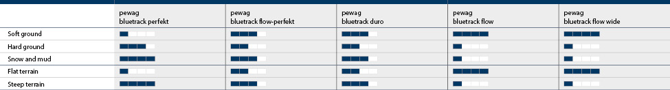 pewag bluetrack flow-perfekt is een gecombineerde track die de beste eigenschappen van tractie en bodembescherming in één track samenbrengt. De track is een combinatie van bluetrack flow en bluetrack perfekt en past zich daardoor perfect aan de verschillende omstandigheden in de bosbouw aan. De track kan universeel op alle ondergronden worden gebruikt.